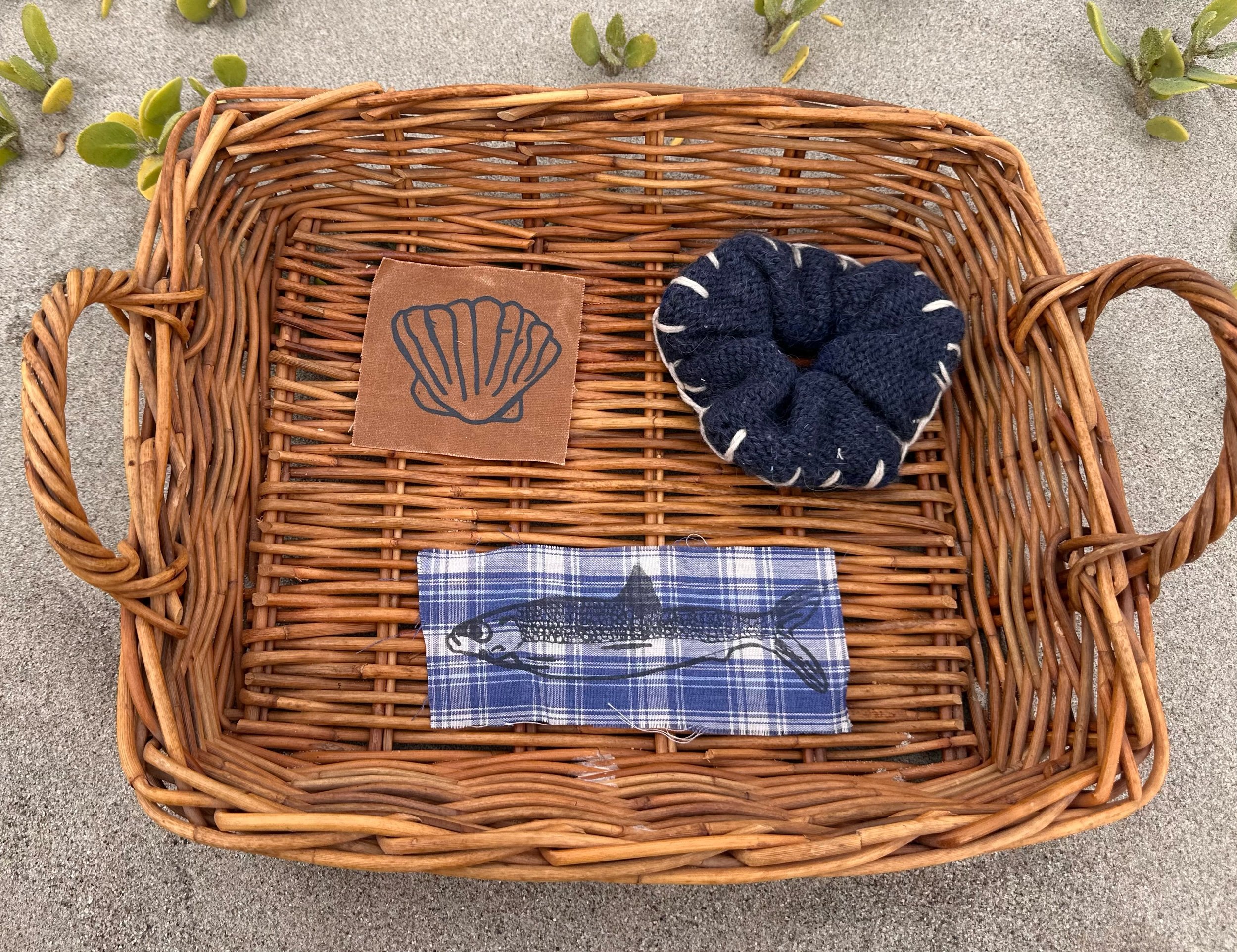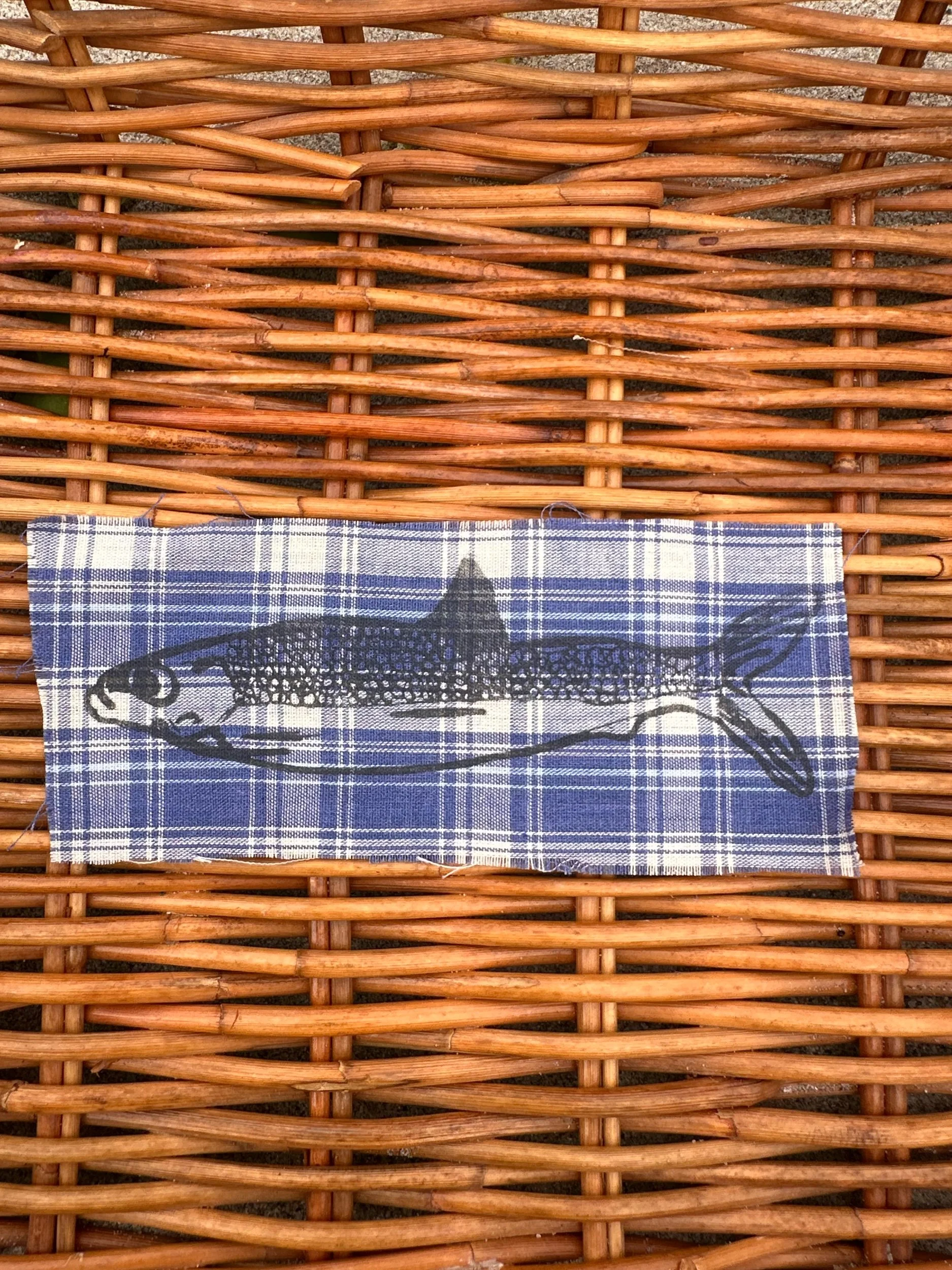 Fish patch: illustrated and printed in-house on soft blue plaid upcycled fabric.