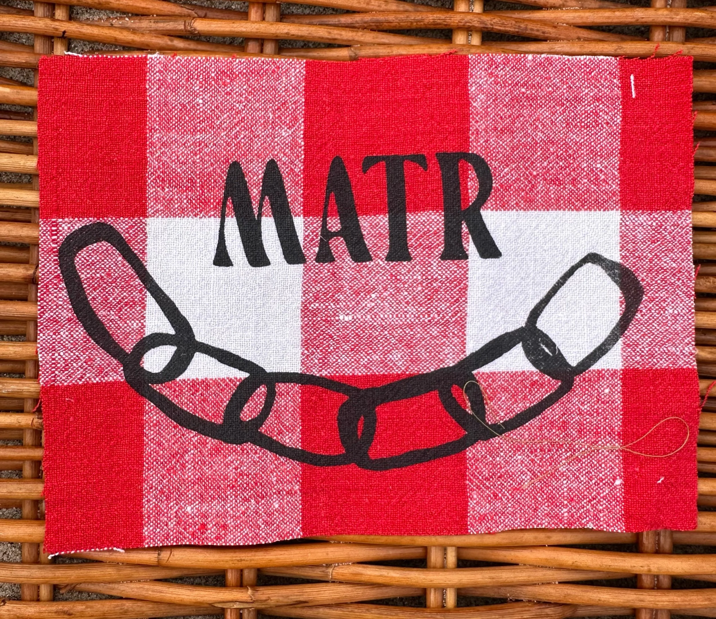 MATR + chains patch illustrated and printed in-house on gingham upcycled fabric.