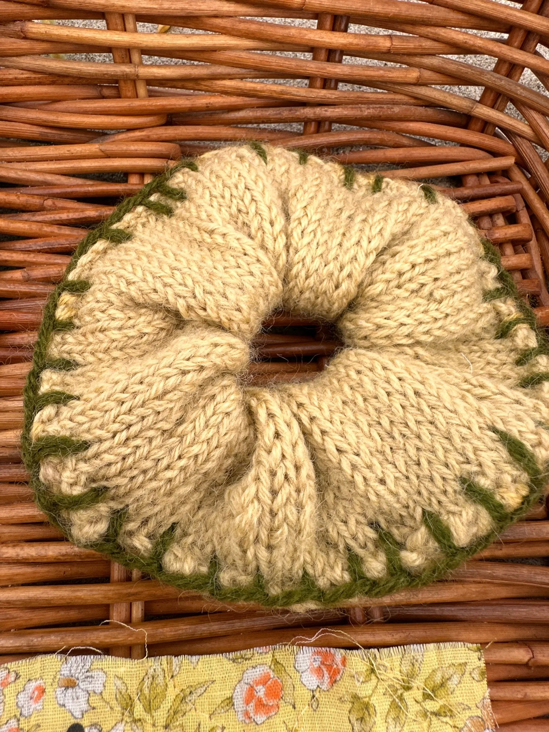 Wool tapestry scrunchie: buttery wool with a kelp green hand-embroidered accent for texture and warmth.
